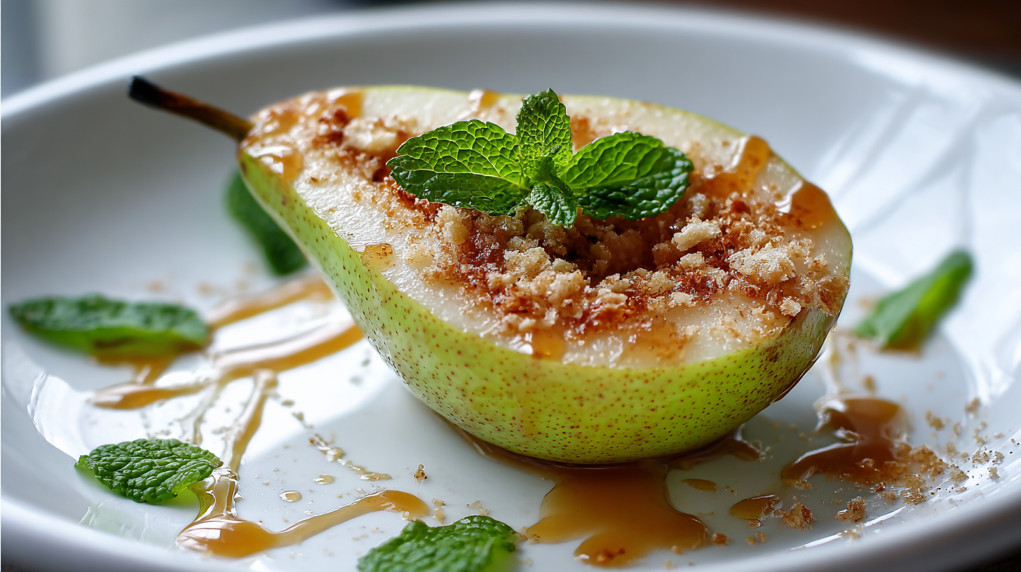 Baked pears stuffed with almond butter and topped with agave, cardamom, and mint.