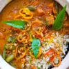 Noodles in Thai green curry with hearts of palm, tofu, and trumpet mushrooms