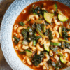 Whole wheat pasta with a “meaty” tomato sauce, zucchini, olives, grated CT Parmesan, and basil.