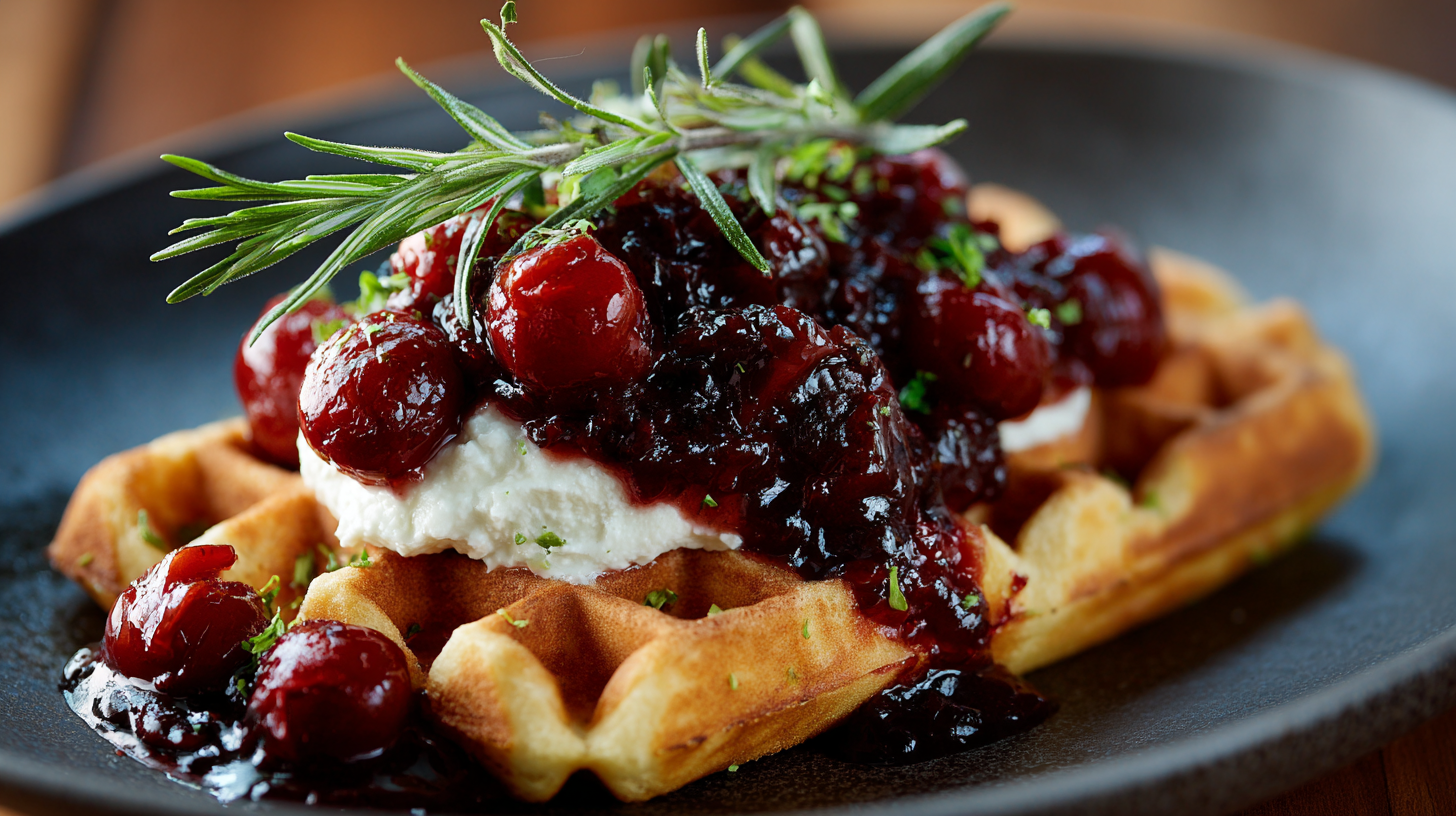 Whole grain or GF waffles with cherry compote, almond ricotta, and a touch of rosemary.
