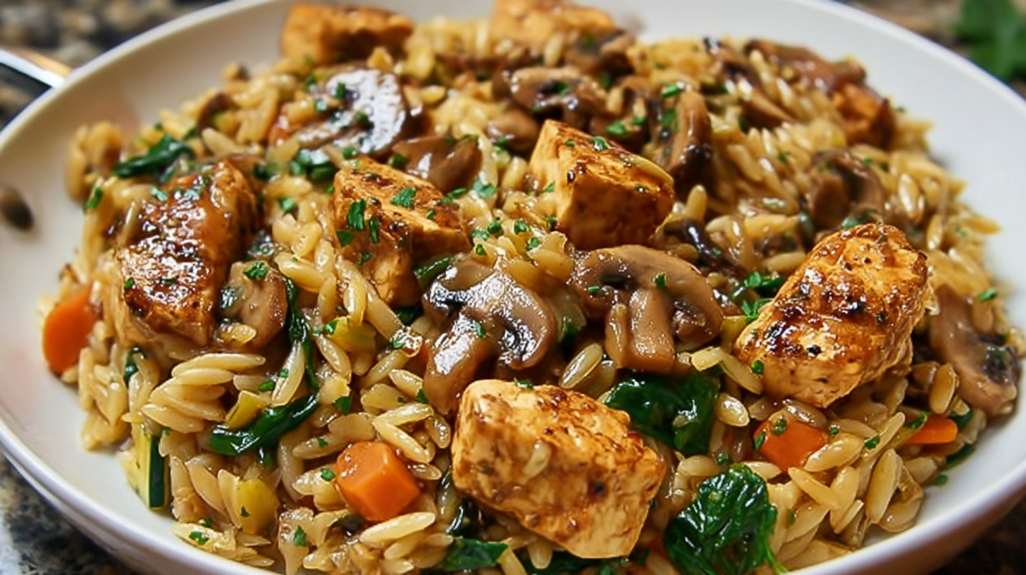 Orzo in marsala sauce with blackened tofu chick’n, mushrooms, carrots, zucchini, and spinach.