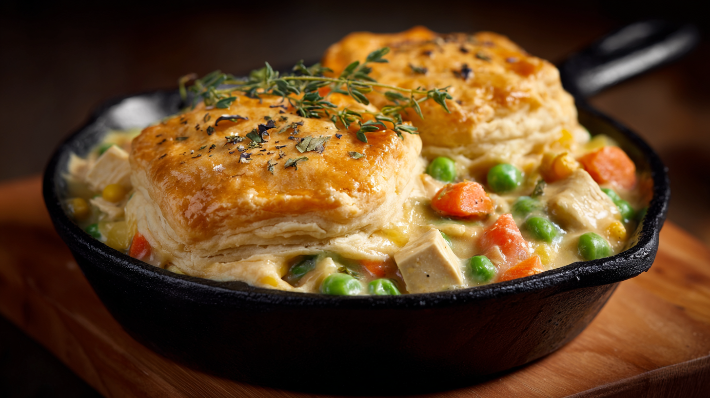 Our version of a classic chicken pot pie with chick’n, peas, carrots, celery, and onions topped with puff pastry.
