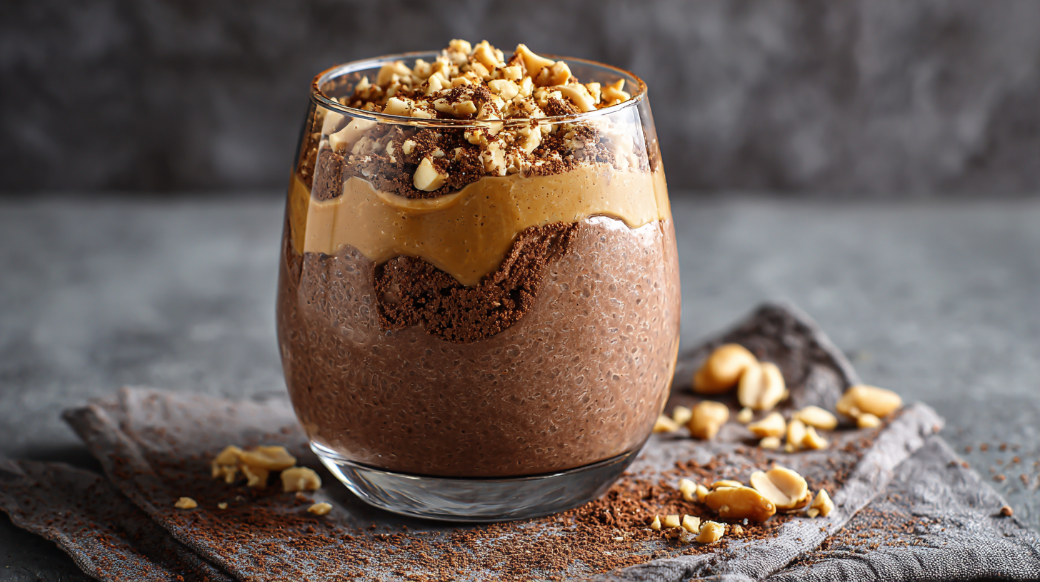 A semi-sweet dark chocolate chia pudding topped with peanut butter cream and crushed peanuts.