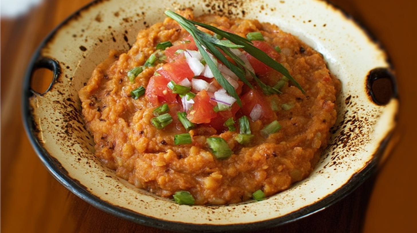 Mashed berbere fava beans with tomato, onion, and green chiles.