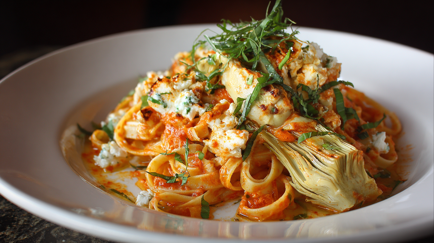 Fettucine lightly tossed in a spicy tomato sauce with roasted artichokes, ricotta, and basil. Served with a side of marinated cannellini beans.