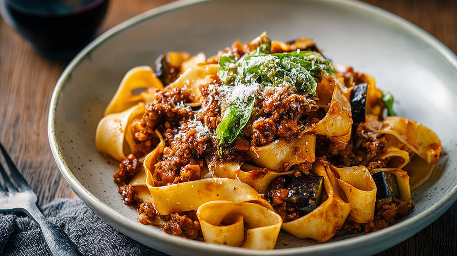 Pasta with walnut ragu, eggplant, CT parm, and basil.