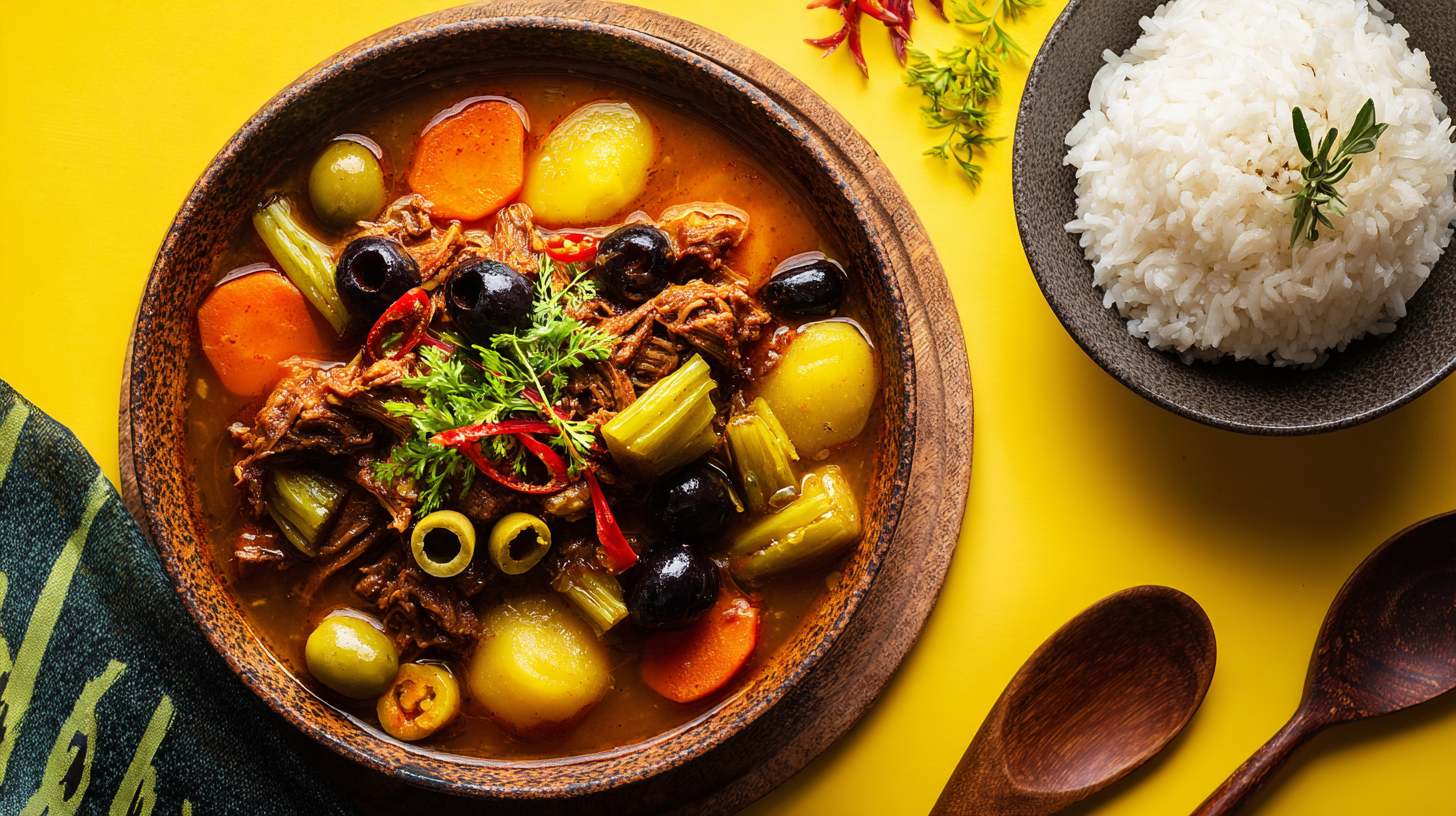 A “beef” stew with soy curls, potatoes, carrots, celery, and olives. Served with rice.